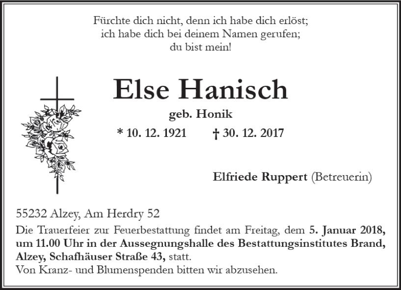 Hier finden Sie alle Traueranzeigen aus der Zeitung, die bisher für Else Hanisch erschienen sind. Weitere Traueranzeigen, die in der Zeitung erscheinen, werden hier ebenfalls aufgelistet