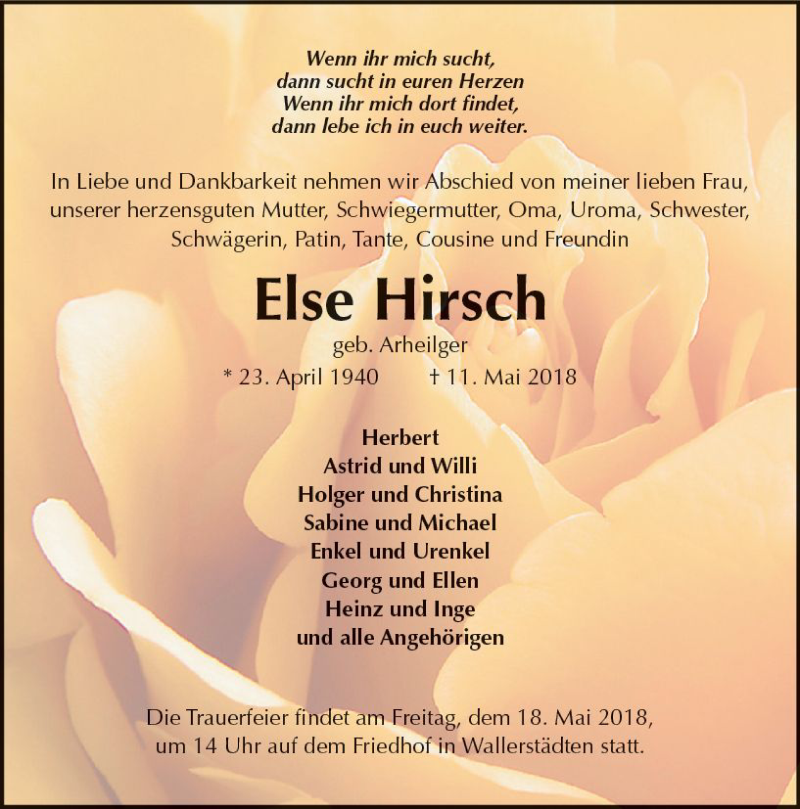 Hier finden Sie alle Traueranzeigen aus der Zeitung, die bisher für Else Hirsch erschienen sind. Weitere Traueranzeigen, die in der Zeitung erscheinen, werden hier ebenfalls aufgelistet