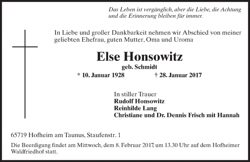 Hier finden Sie alle Traueranzeigen aus der Zeitung, die bisher für Else Honsowitz erschienen sind. Weitere Traueranzeigen, die in der Zeitung erscheinen, werden hier ebenfalls aufgelistet