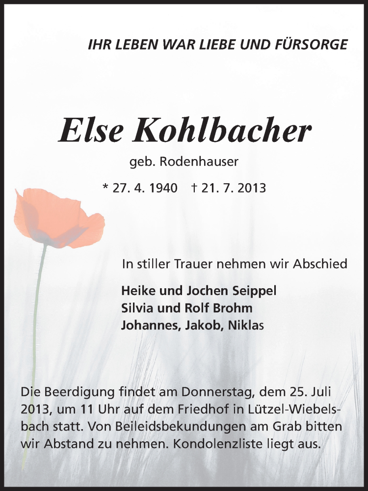 Hier finden Sie alle Traueranzeigen aus der Zeitung, die bisher für Else Kohlbacher erschienen sind. Weitere Traueranzeigen, die in der Zeitung erscheinen, werden hier ebenfalls aufgelistet