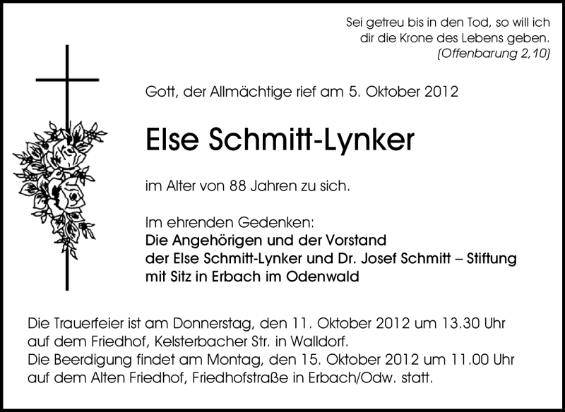 Hier finden Sie alle Traueranzeigen aus der Zeitung, die bisher für Else Schmitt-Lynker erschienen sind. Weitere Traueranzeigen, die in der Zeitung erscheinen, werden hier ebenfalls aufgelistet