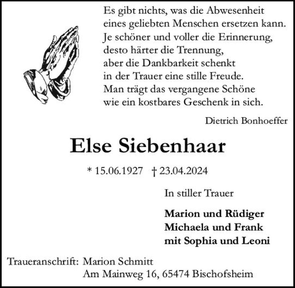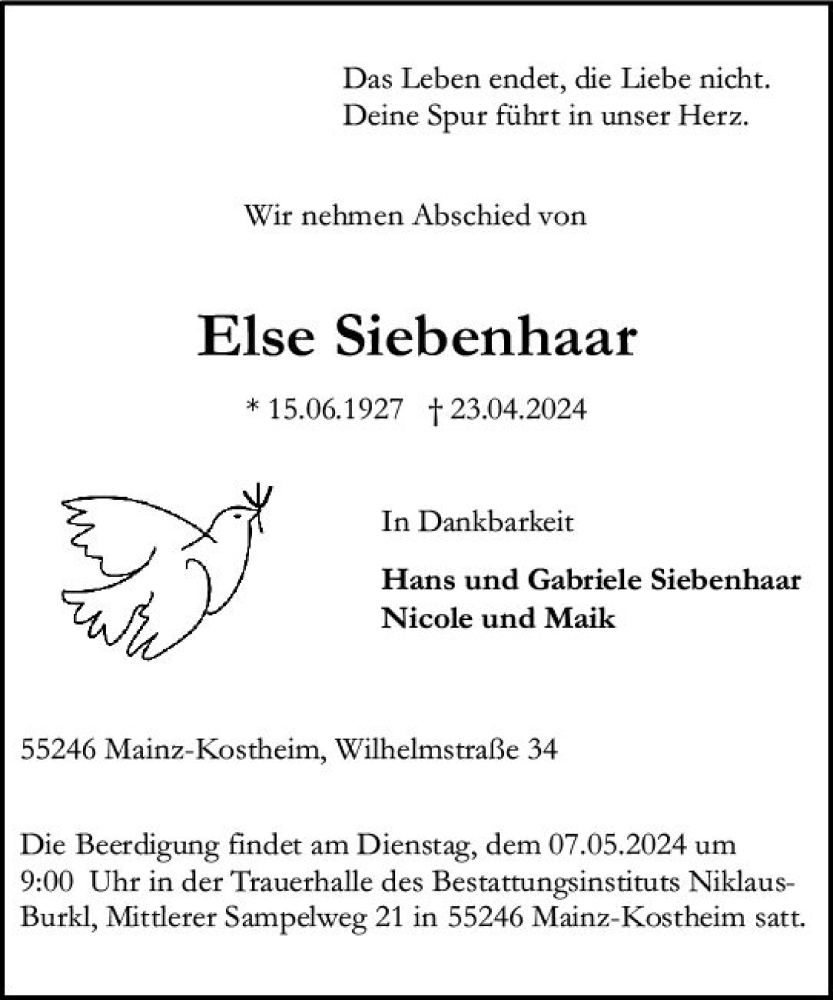 Hier finden Sie alle Traueranzeigen aus der Zeitung, die bisher für Else Siebenhaar erschienen sind. Weitere Traueranzeigen, die in der Zeitung erscheinen, werden hier ebenfalls aufgelistet