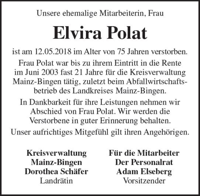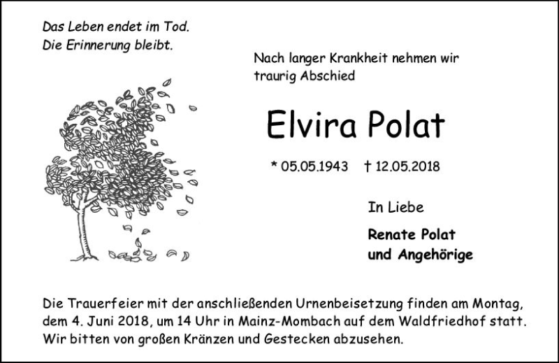 Hier finden Sie alle Traueranzeigen aus der Zeitung, die bisher für Elvira Polat erschienen sind. Weitere Traueranzeigen, die in der Zeitung erscheinen, werden hier ebenfalls aufgelistet