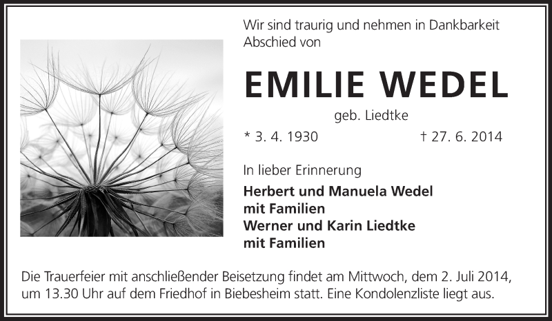 Hier finden Sie alle Traueranzeigen aus der Zeitung, die bisher für Emilie Wedel erschienen sind. Weitere Traueranzeigen, die in der Zeitung erscheinen, werden hier ebenfalls aufgelistet