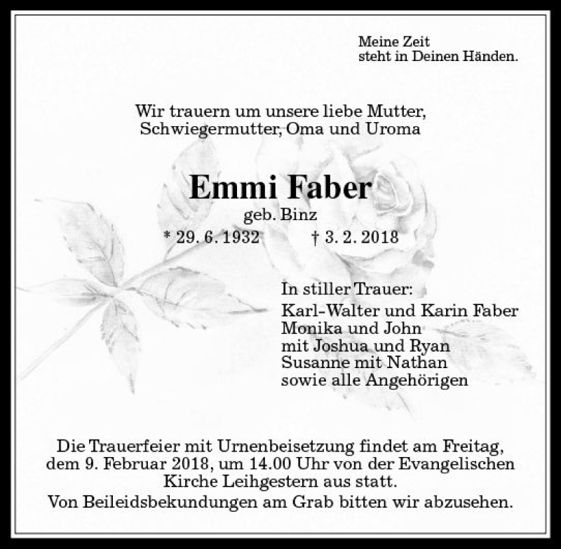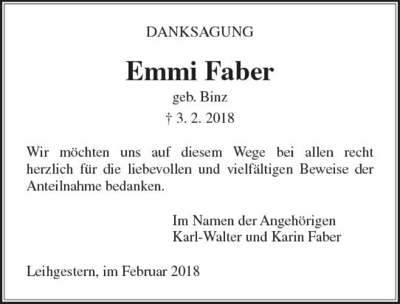 Hier finden Sie alle Traueranzeigen aus der Zeitung, die bisher für Emmi Faber erschienen sind. Weitere Traueranzeigen, die in der Zeitung erscheinen, werden hier ebenfalls aufgelistet