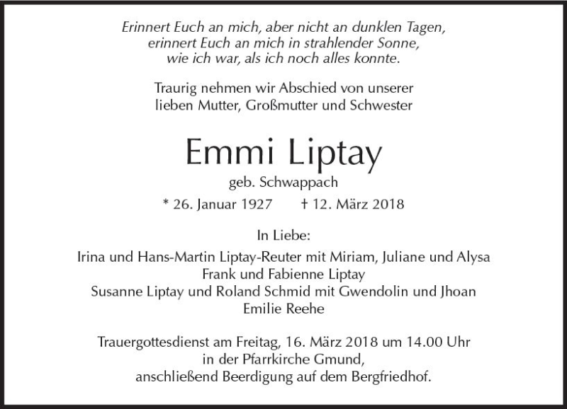 Hier finden Sie alle Traueranzeigen aus der Zeitung, die bisher für Emmi Liptay erschienen sind. Weitere Traueranzeigen, die in der Zeitung erscheinen, werden hier ebenfalls aufgelistet