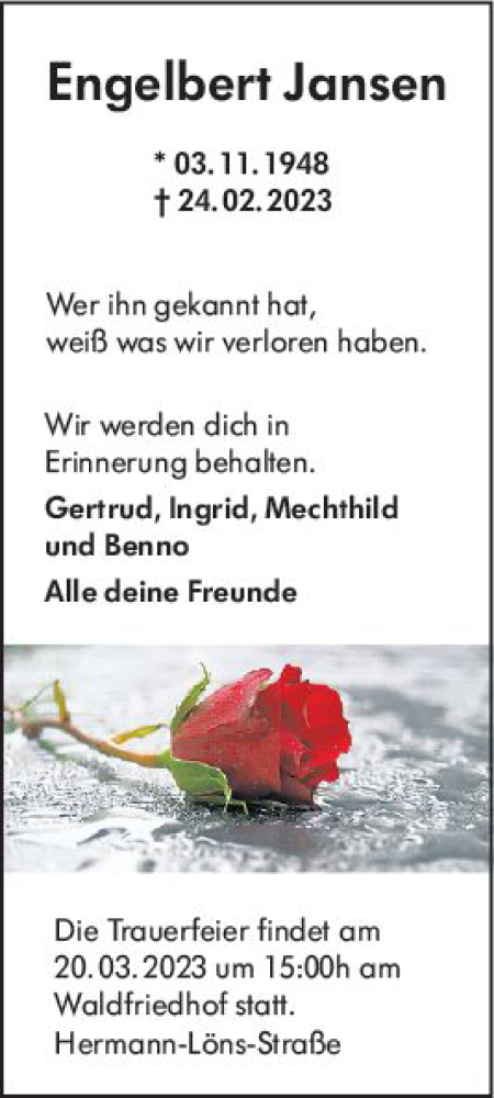 Hier finden Sie alle Traueranzeigen aus der Zeitung, die bisher für Engelbert Jansen erschienen sind. Weitere Traueranzeigen, die in der Zeitung erscheinen, werden hier ebenfalls aufgelistet