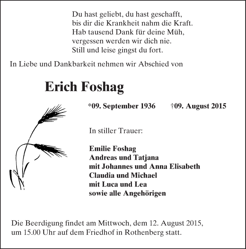 Hier finden Sie alle Traueranzeigen aus der Zeitung, die bisher für Erich Foshag erschienen sind. Weitere Traueranzeigen, die in der Zeitung erscheinen, werden hier ebenfalls aufgelistet