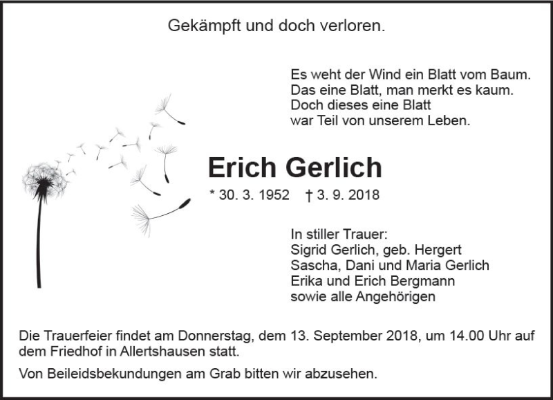 Hier finden Sie alle Traueranzeigen aus der Zeitung, die bisher für Erich Gerlich erschienen sind. Weitere Traueranzeigen, die in der Zeitung erscheinen, werden hier ebenfalls aufgelistet