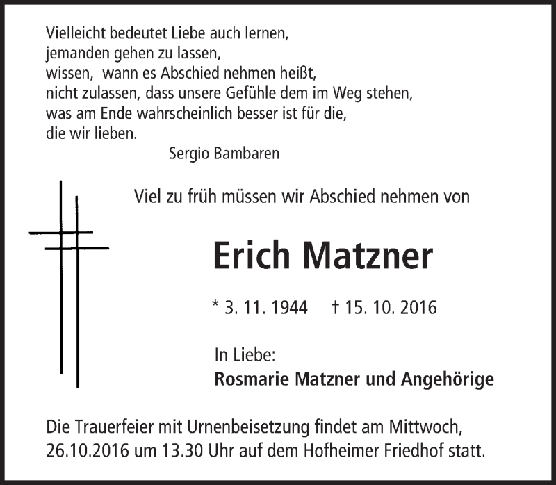 Hier finden Sie alle Traueranzeigen aus der Zeitung, die bisher für Erich Matzner erschienen sind. Weitere Traueranzeigen, die in der Zeitung erscheinen, werden hier ebenfalls aufgelistet