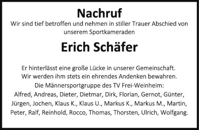 Hier finden Sie alle Traueranzeigen aus der Zeitung, die bisher für Erich Schäfer erschienen sind. Weitere Traueranzeigen, die in der Zeitung erscheinen, werden hier ebenfalls aufgelistet