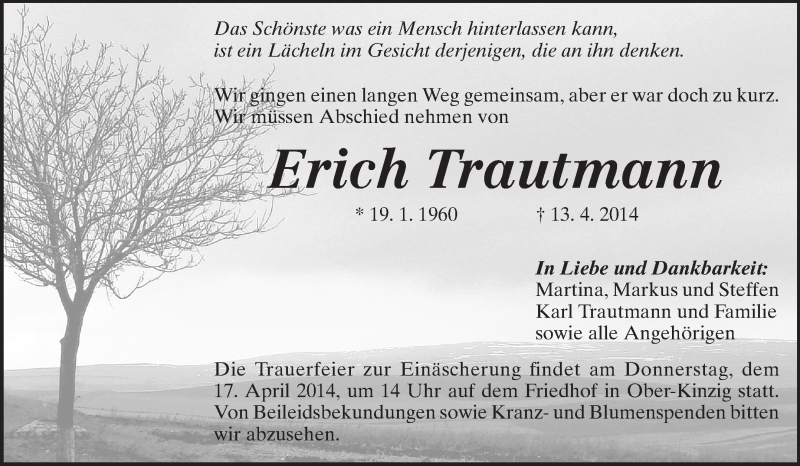 Hier finden Sie alle Traueranzeigen aus der Zeitung, die bisher für Erich Trautmann erschienen sind. Weitere Traueranzeigen, die in der Zeitung erscheinen, werden hier ebenfalls aufgelistet