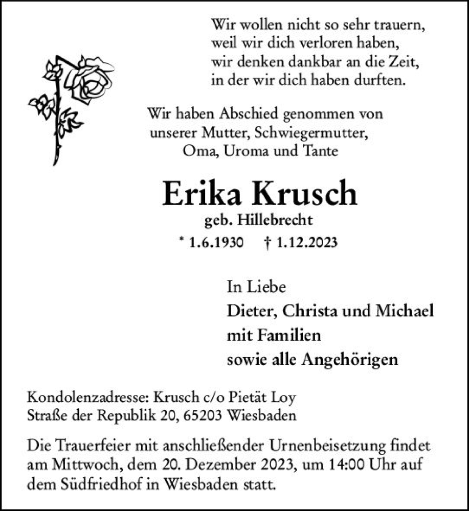 Hier finden Sie alle Traueranzeigen aus der Zeitung, die bisher für Erika Krusch erschienen sind. Weitere Traueranzeigen, die in der Zeitung erscheinen, werden hier ebenfalls aufgelistet