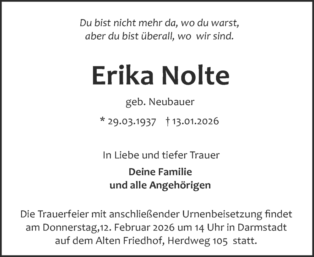 Hier finden Sie alle Traueranzeigen aus der Zeitung, die bisher für Erika Nolte erschienen sind. Weitere Traueranzeigen, die in der Zeitung erscheinen, werden hier ebenfalls aufgelistet