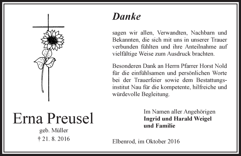 Hier finden Sie alle Traueranzeigen aus der Zeitung, die bisher für Erna Preusel erschienen sind. Weitere Traueranzeigen, die in der Zeitung erscheinen, werden hier ebenfalls aufgelistet