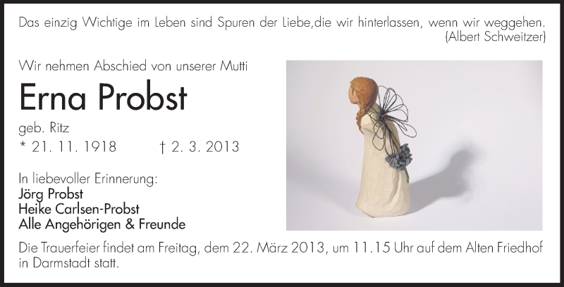 Hier finden Sie alle Traueranzeigen aus der Zeitung, die bisher für Erna Probst erschienen sind. Weitere Traueranzeigen, die in der Zeitung erscheinen, werden hier ebenfalls aufgelistet