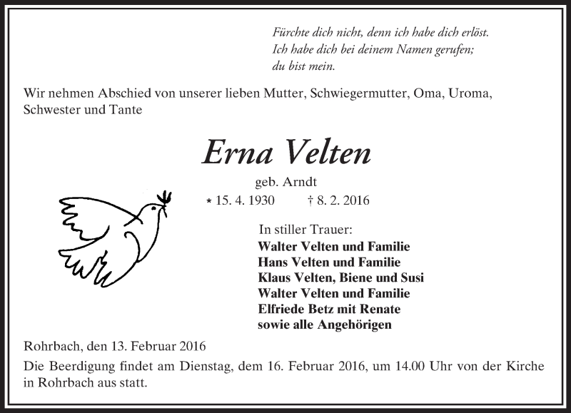 Hier finden Sie alle Traueranzeigen aus der Zeitung, die bisher für Erna Velten erschienen sind. Weitere Traueranzeigen, die in der Zeitung erscheinen, werden hier ebenfalls aufgelistet