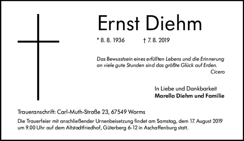 Hier finden Sie alle Traueranzeigen aus der Zeitung, die bisher für Ernst Diehm erschienen sind. Weitere Traueranzeigen, die in der Zeitung erscheinen, werden hier ebenfalls aufgelistet