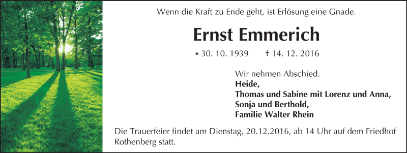 Hier finden Sie alle Traueranzeigen aus der Zeitung, die bisher für Ernst Emmerich erschienen sind. Weitere Traueranzeigen, die in der Zeitung erscheinen, werden hier ebenfalls aufgelistet
