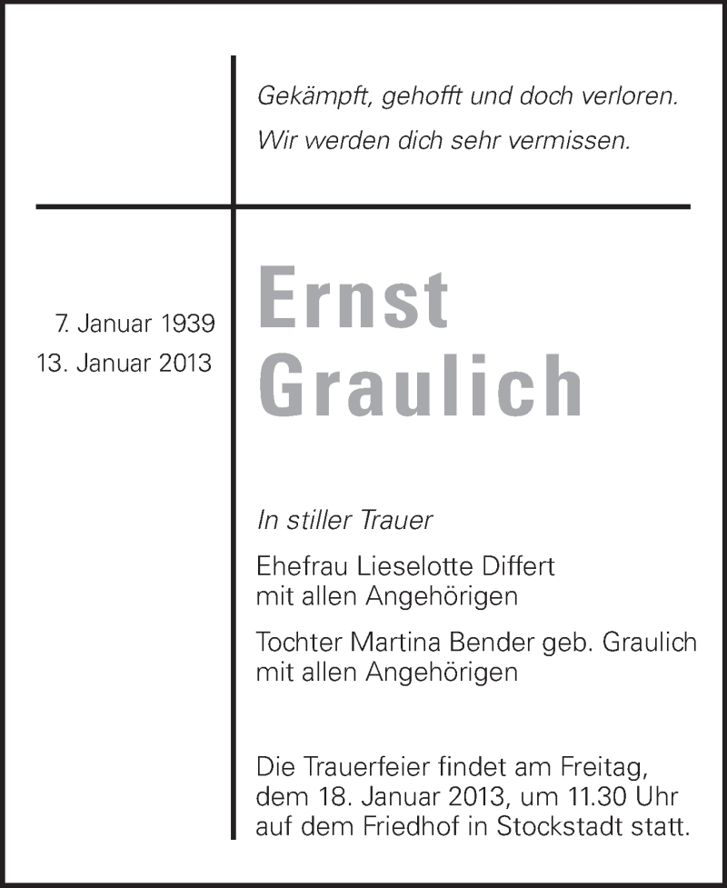 Hier finden Sie alle Traueranzeigen aus der Zeitung, die bisher für Ernst Graulich erschienen sind. Weitere Traueranzeigen, die in der Zeitung erscheinen, werden hier ebenfalls aufgelistet