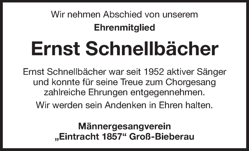 Hier finden Sie alle Traueranzeigen aus der Zeitung, die bisher für Ernst Schnellbächer erschienen sind. Weitere Traueranzeigen, die in der Zeitung erscheinen, werden hier ebenfalls aufgelistet