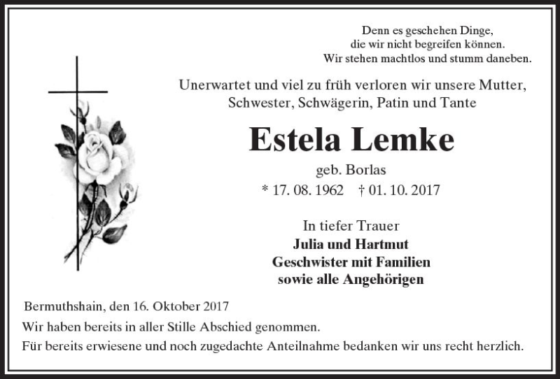 Hier finden Sie alle Traueranzeigen aus der Zeitung, die bisher für Estela Lemke erschienen sind. Weitere Traueranzeigen, die in der Zeitung erscheinen, werden hier ebenfalls aufgelistet