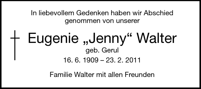 Hier finden Sie alle Traueranzeigen aus der Zeitung, die bisher für Eugenie Walter erschienen sind. Weitere Traueranzeigen, die in der Zeitung erscheinen, werden hier ebenfalls aufgelistet