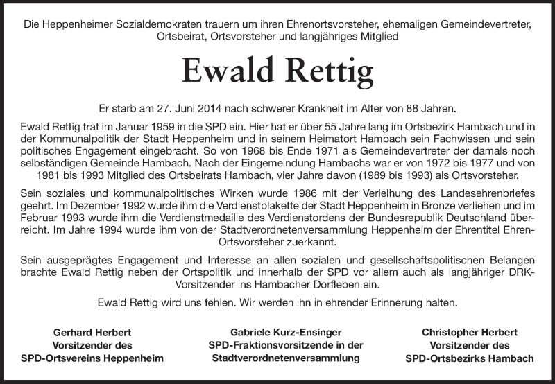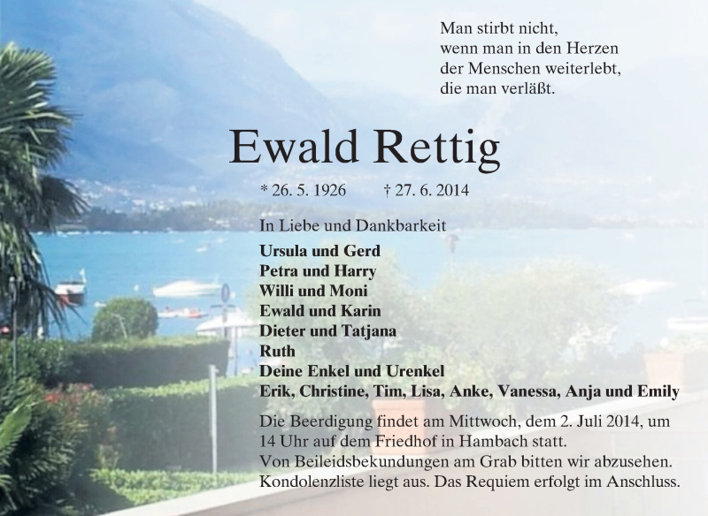 Hier finden Sie alle Traueranzeigen aus der Zeitung, die bisher für Ewald Rettig erschienen sind. Weitere Traueranzeigen, die in der Zeitung erscheinen, werden hier ebenfalls aufgelistet