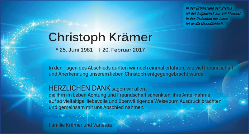 Hier finden Sie alle Traueranzeigen aus der Zeitung, die bisher für Familie Krämer und Vanessa erschienen sind. Weitere Traueranzeigen, die in der Zeitung erscheinen, werden hier ebenfalls aufgelistet