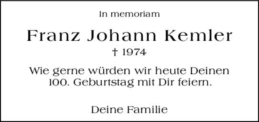 Hier finden Sie alle Traueranzeigen aus der Zeitung, die bisher für Franz Johann Kemler erschienen sind. Weitere Traueranzeigen, die in der Zeitung erscheinen, werden hier ebenfalls aufgelistet