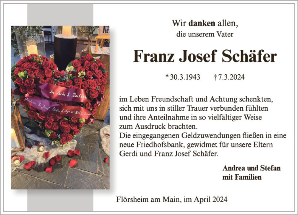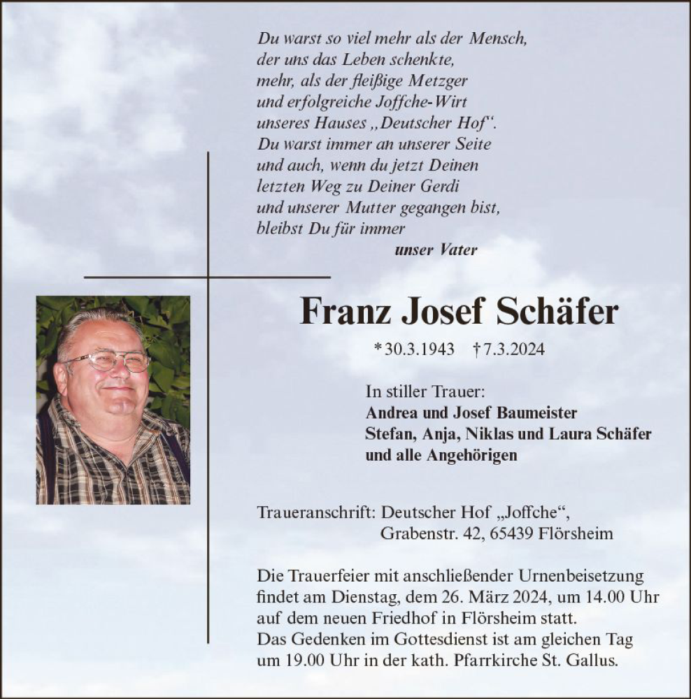 Hier finden Sie alle Traueranzeigen aus der Zeitung, die bisher für Franz Josef Schäfer erschienen sind. Weitere Traueranzeigen, die in der Zeitung erscheinen, werden hier ebenfalls aufgelistet