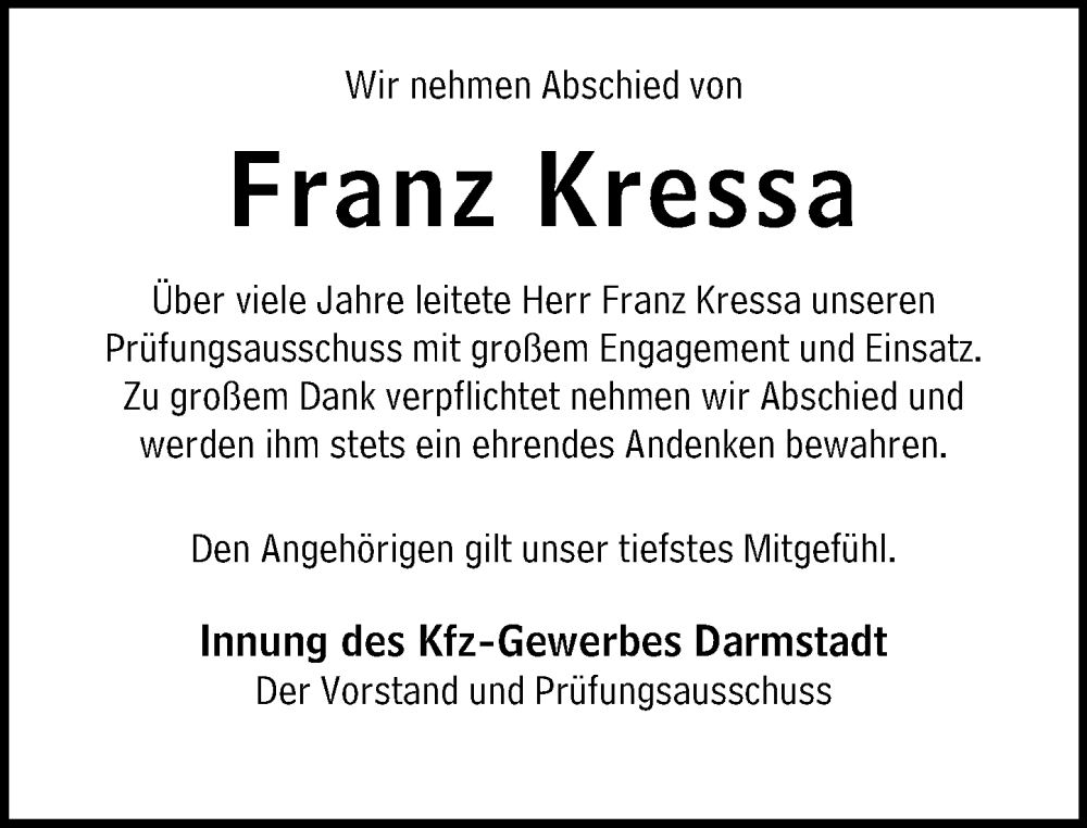Hier finden Sie alle Traueranzeigen aus der Zeitung, die bisher für Franz Kressa erschienen sind. Weitere Traueranzeigen, die in der Zeitung erscheinen, werden hier ebenfalls aufgelistet
