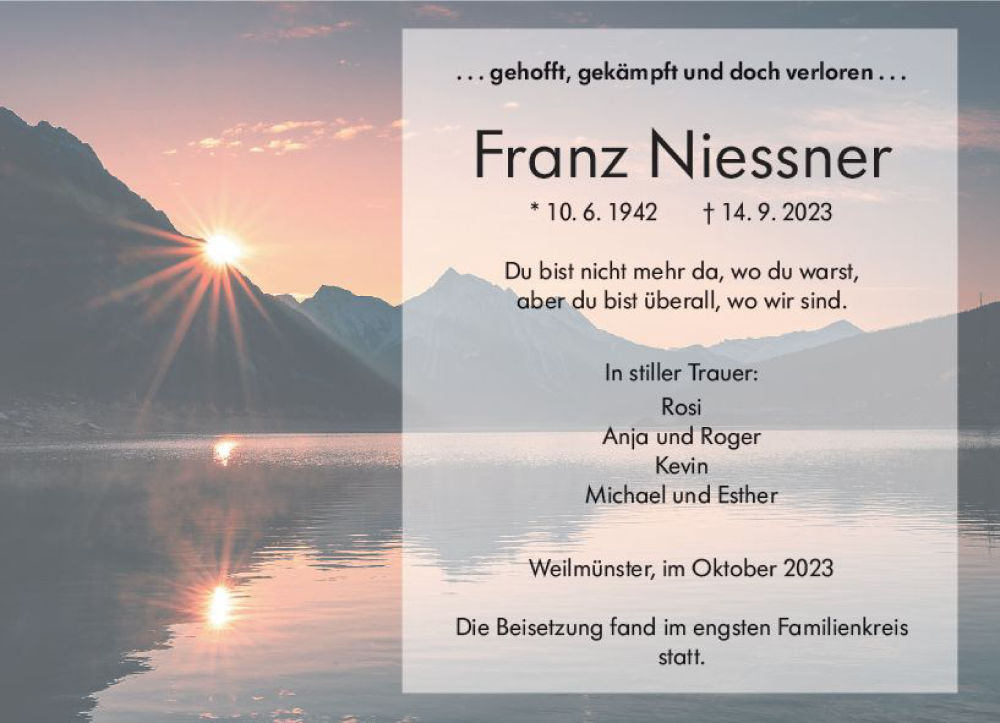 Hier finden Sie alle Traueranzeigen aus der Zeitung, die bisher für Franz Niessner erschienen sind. Weitere Traueranzeigen, die in der Zeitung erscheinen, werden hier ebenfalls aufgelistet