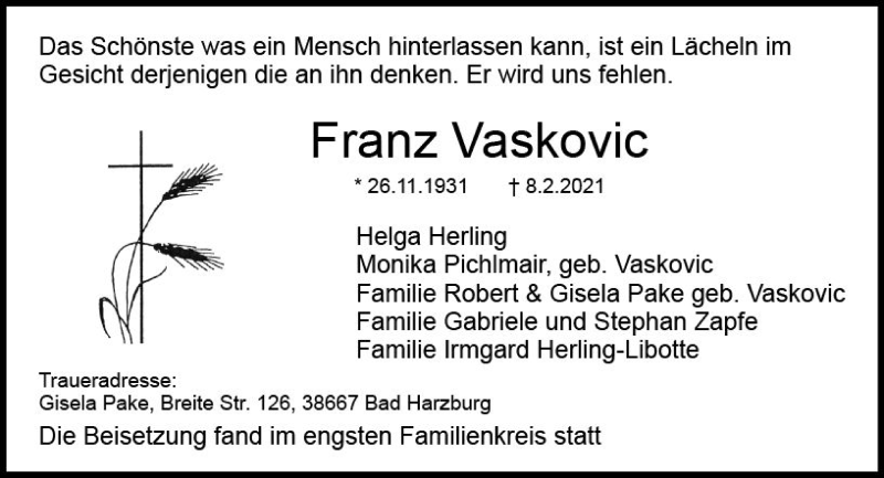 Hier finden Sie alle Traueranzeigen aus der Zeitung, die bisher für Franz Vaskovic erschienen sind. Weitere Traueranzeigen, die in der Zeitung erscheinen, werden hier ebenfalls aufgelistet