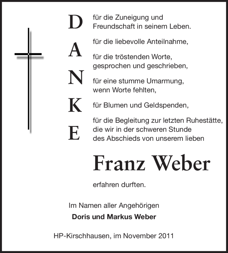 Hier finden Sie alle Traueranzeigen aus der Zeitung, die bisher für Franz Weber erschienen sind. Weitere Traueranzeigen, die in der Zeitung erscheinen, werden hier ebenfalls aufgelistet