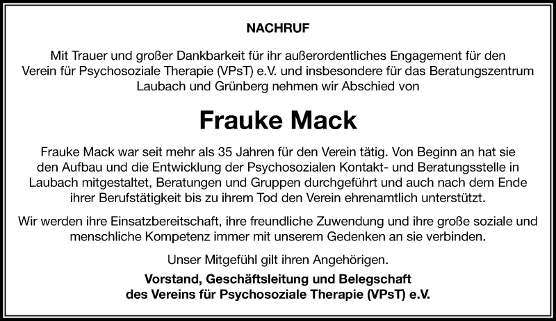 Hier finden Sie alle Traueranzeigen aus der Zeitung, die bisher für Frauke Mack erschienen sind. Weitere Traueranzeigen, die in der Zeitung erscheinen, werden hier ebenfalls aufgelistet