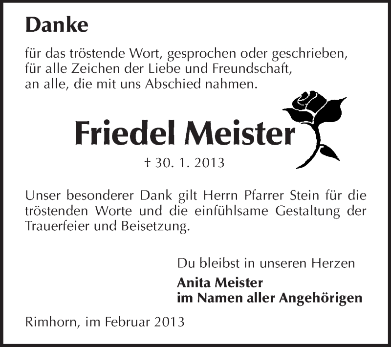 Hier finden Sie alle Traueranzeigen aus der Zeitung, die bisher für Friedel Meister erschienen sind. Weitere Traueranzeigen, die in der Zeitung erscheinen, werden hier ebenfalls aufgelistet
