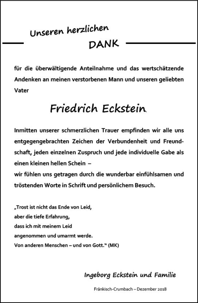 Hier finden Sie alle Traueranzeigen aus der Zeitung, die bisher für Friedrich Eckstein erschienen sind. Weitere Traueranzeigen, die in der Zeitung erscheinen, werden hier ebenfalls aufgelistet