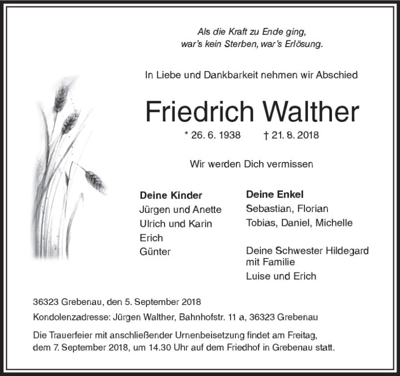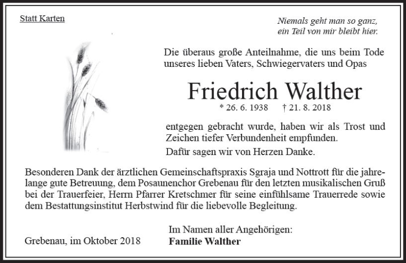 Hier finden Sie alle Traueranzeigen aus der Zeitung, die bisher für Friedrich Walther erschienen sind. Weitere Traueranzeigen, die in der Zeitung erscheinen, werden hier ebenfalls aufgelistet