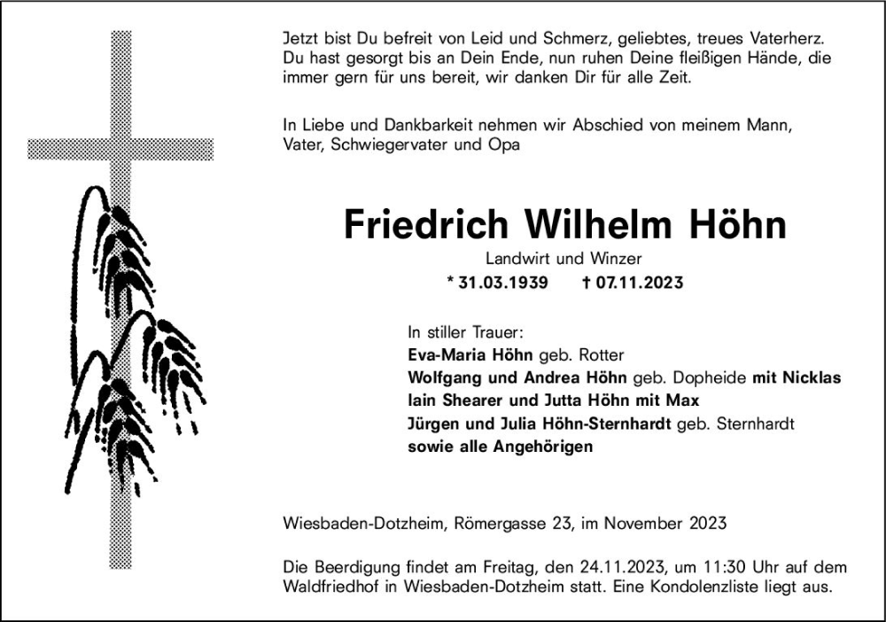 Hier finden Sie alle Traueranzeigen aus der Zeitung, die bisher für Friedrich Wilhelm Höhn erschienen sind. Weitere Traueranzeigen, die in der Zeitung erscheinen, werden hier ebenfalls aufgelistet