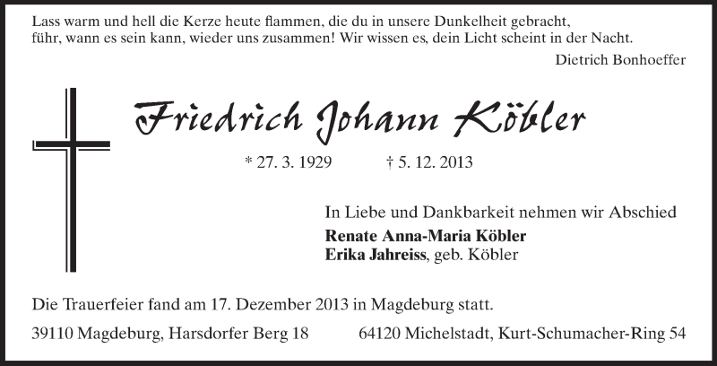 Hier finden Sie alle Traueranzeigen aus der Zeitung, die bisher für Friedrich Johann Köbler erschienen sind. Weitere Traueranzeigen, die in der Zeitung erscheinen, werden hier ebenfalls aufgelistet