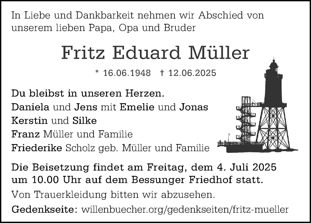 Hier finden Sie alle Traueranzeigen aus der Zeitung, die bisher für Fritz Eduard Müller erschienen sind. Weitere Traueranzeigen, die in der Zeitung erscheinen, werden hier ebenfalls aufgelistet