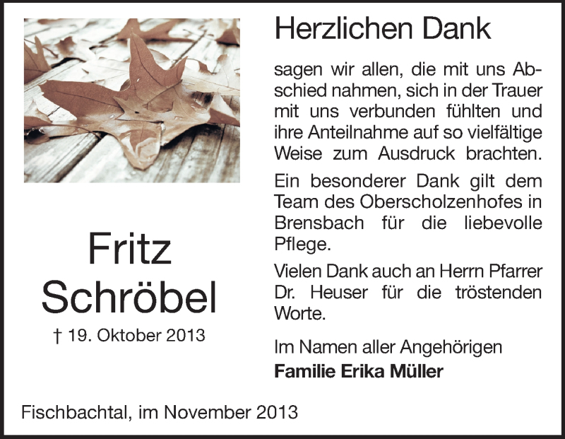 Hier finden Sie alle Traueranzeigen aus der Zeitung, die bisher für Fritz Schröbel erschienen sind. Weitere Traueranzeigen, die in der Zeitung erscheinen, werden hier ebenfalls aufgelistet