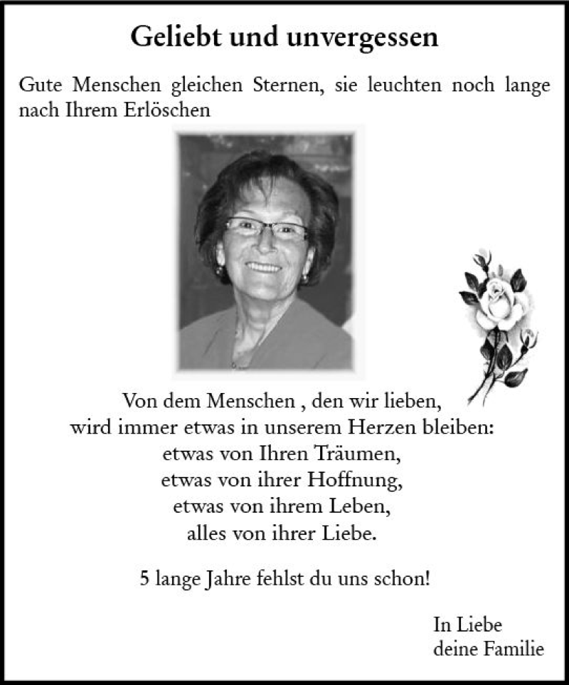 Hier finden Sie alle Traueranzeigen aus der Zeitung, die bisher für Geliebt und unvergessen erschienen sind. Weitere Traueranzeigen, die in der Zeitung erscheinen, werden hier ebenfalls aufgelistet