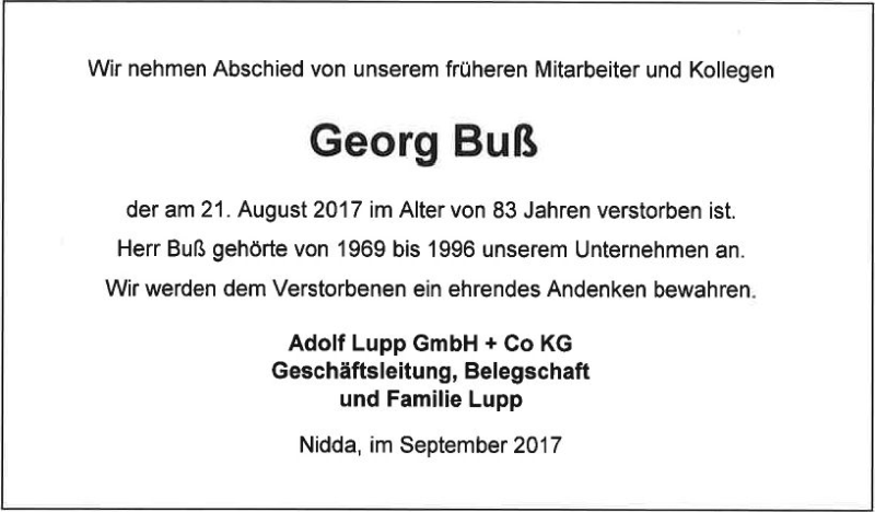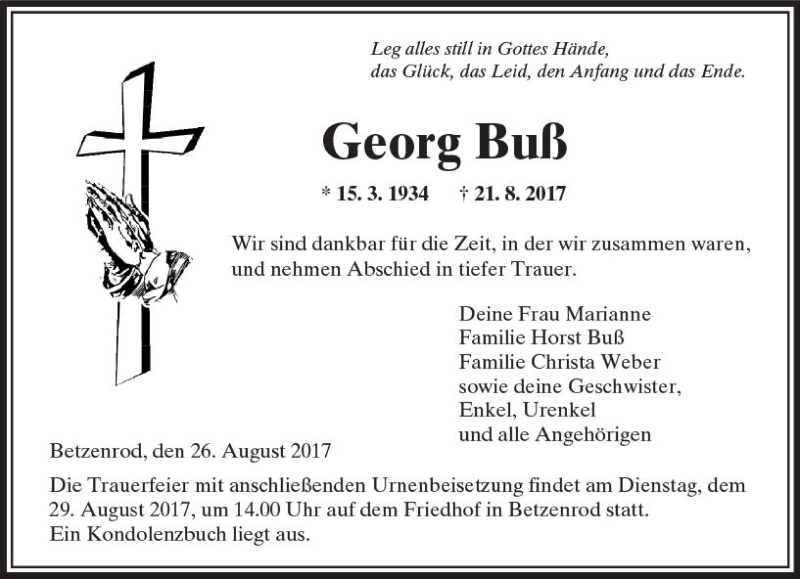 Hier finden Sie alle Traueranzeigen aus der Zeitung, die bisher für Georg Buß erschienen sind. Weitere Traueranzeigen, die in der Zeitung erscheinen, werden hier ebenfalls aufgelistet