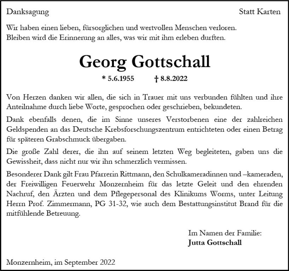 Hier finden Sie alle Traueranzeigen aus der Zeitung, die bisher für Georg Gottschall erschienen sind. Weitere Traueranzeigen, die in der Zeitung erscheinen, werden hier ebenfalls aufgelistet
