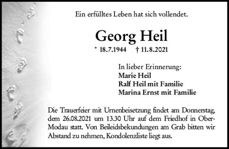 Hier finden Sie alle Traueranzeigen aus der Zeitung, die bisher für Georg Heil erschienen sind. Weitere Traueranzeigen, die in der Zeitung erscheinen, werden hier ebenfalls aufgelistet
