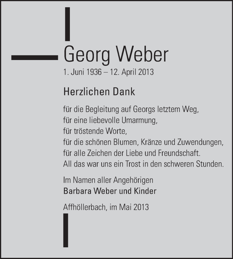 Hier finden Sie alle Traueranzeigen aus der Zeitung, die bisher für Georg Weber erschienen sind. Weitere Traueranzeigen, die in der Zeitung erscheinen, werden hier ebenfalls aufgelistet