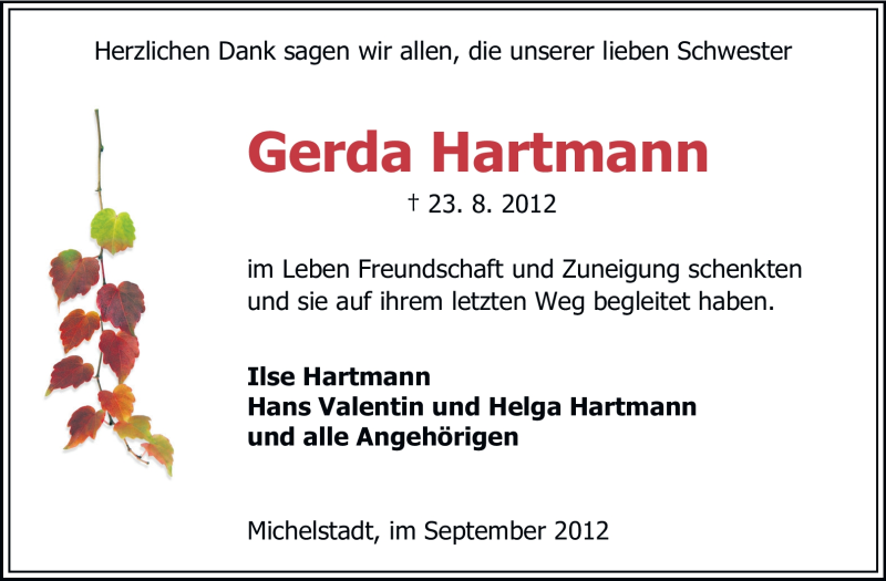 Hier finden Sie alle Traueranzeigen aus der Zeitung, die bisher für Gerda Hartmann erschienen sind. Weitere Traueranzeigen, die in der Zeitung erscheinen, werden hier ebenfalls aufgelistet