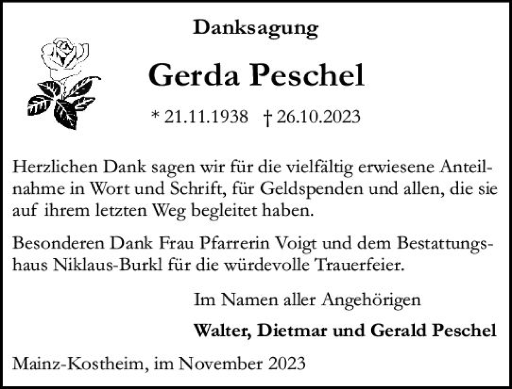 Hier finden Sie alle Traueranzeigen aus der Zeitung, die bisher für Gerda Peschel erschienen sind. Weitere Traueranzeigen, die in der Zeitung erscheinen, werden hier ebenfalls aufgelistet